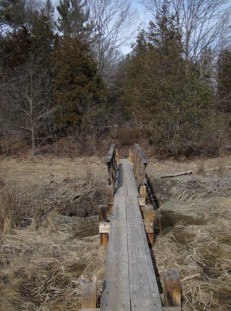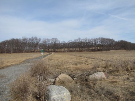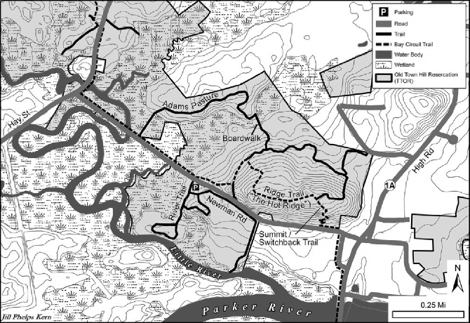 The Hay Street Trails. Two short trails, one on each side of the road, lead from a pulloff on Hay Street about one quarter mile north of its intersection with Newman Road. This area is also part of the Old Town Hill property. Each of these trails begins at a green gate and each leads to freshwater wetlands and marsh. The trail on the west is part of the Bay Circuit Trail, which emerges from the woods at the parking pulloff.