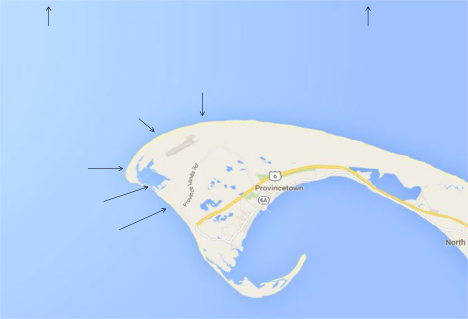 Perhaps seabird movements are circular off Provincetown. For example, early in the morning of October 20, 2015, Kate Sutherland and I followed the movements of several hundred shearwaters that traveled east to west along the deep water rip line approximately 1,500 feet offshore from Race Point Beach toward Race Point. Once at Race Point, many of the shearwaters veered off to the north and northwest toward the southwestern corner of Stellwagen Bank. During the early afternoon, we saw several hundred shearwaters moving west to east—perhaps coming off the bank—beyond the deep water rip line. They formed several large beehives, or feeding aggregations, off to the northeast in the vicinity of the southeastern corner of Stellwagen Bank and the Peaked Hill Area. Did these shearwaters travel in a clockwise circle from the rips off Race Point to Stellwagen Bank and then off to the east this particular day? See Figure 1, for on and offshore locations around Provincetown.