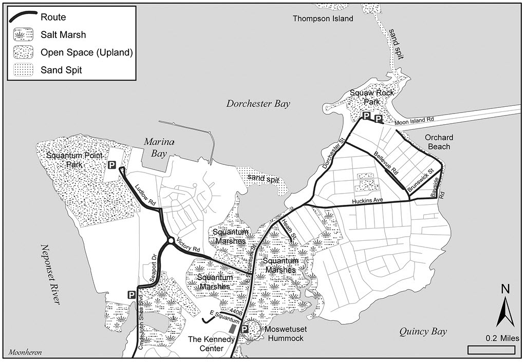 As its name suggests, the Hummock is a small, elevated, mostly oak-treed city park that looks out over Quincy Bay and an adjacent salt marsh. It is located along the main causeway at the beginning of Squantum and is next to the north end of Wollaston Beach. The parking lot is directly across the street from the Kennedy Center building at 440 East Squantum Street. (See Figure 1. Overview Map of Squantum.)