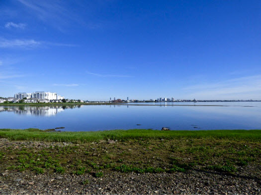Return to East Squantum Street and either walk or drive for 0.4 mile, then turn right onto Heath Street, and continue to the end of the cul-de-sac to view another section of salt marsh with an osprey platform. If the tide is high, it's worth checking the marsh, boat docks, and walkways that jut out into the marsh for birds; bypass this area at low tide. Before returning to East Squantum Street, park on Heath Street and cross the main road to scan north at the seawall into the waters of Dorchester Bay. The large condominium buildings of Marina Bay are in view across the bay with the Boston skyline in the background.