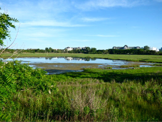 Retrace your route from Squantum Point Park and head down Ludlow Road, then turn right onto Victory Road. At the rotary, take the first right onto Seaport Drive. Follow it 0.3 mile to the end, and take a left onto Commander Shea Boulevard. Almost immediately there is a small parking area on the right with a kiosk for the Quincy Riverwalk. The Commander Shea Boulevard area features small sections of salt marsh and nice views of the Neponset River. If you would prefer a longer walk, you can combine birding this area with Squantum Point Park because the riverwalk connects the two properties. Refer to the kiosk map for more details.