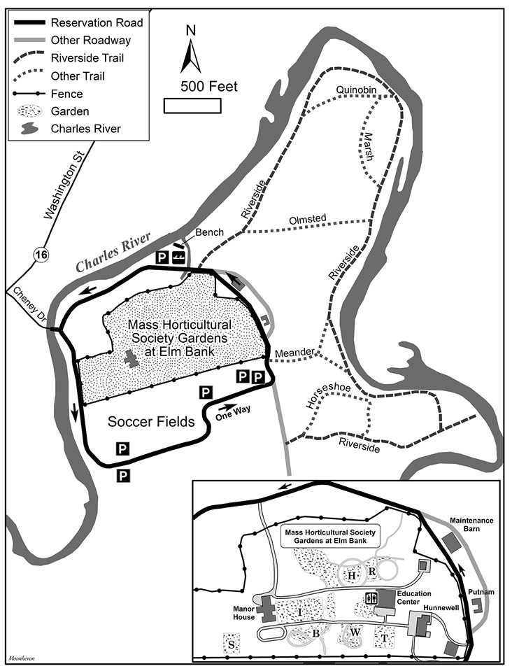 The official address for Elm Bank and Mass Hort is 900 Washington Street, Wellesley. The entrance road, Cheney Drive, is directly off Route 16 (Washington Street) in Wellesley and is marked with a small green sign for Elm Bank that is easy to miss. If you are on Route 16 heading west and reach South Natick Center, or are going east and come to Wellesley College, you have passed it, and you will need to turn around. Drive over the historic, one-lane Cheney Bridge, and turn right on the main reservation road, which is one way. (See Figure 1. Elm Bank Reservation.) In approximately 0.5 mile, turn left at the stop sign. You will see parking lots on your left, but continue around the road past the buildings, greenhouses, Putnam building, and maintenance barn. At the stop sign, turn left, drive across a short stone-walled bridge, and park at the Canoe Launch parking lot. If this small lot is not plowed, drive around the loop again, park in the main lot, and walk down the road to the Canoe Launch.