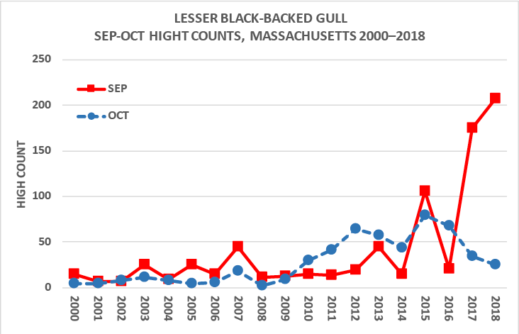 The larid highlight of the period was a new record count: 207. This was the number of Lesser Black-backed Gulls logged at Monomoy on September 17 and beats the previous high count of 190 birds set on Nantucket on January 1, 2010. Lesser Black-backs were once a rare vagrant to North America; the first record was from New Jersey in 1934. The recent and dramatic increase in local numbers (see Figure 1) is a result of a range expansion with breeding populations now established in Iceland (from the 1920s) and Greenland (from 1990). Apart from a handful of hybrid pairings with Herring Gulls, the species has yet to be documented breeding in North America. A juvenile Black-headed Gull at Winthrop was the first Suffolk County record since 2006. An adult Sabine's Gull at Race Point, Provincetown, is about average for the season.