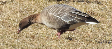 Bristol County, and the adjacent corner of Plymouth County, was the waterfowl capital of Massachusetts this winter. It started with a Pink-footed Goose found at Somerset Reservoir in early December by Matthew Eckerson. The bird remained there through the first few days of January. More than a month later, it or another of its species appeared roughly 20 miles to the east in Rochester, where it was still being seen just before press time. Carol Molander took the photo above.