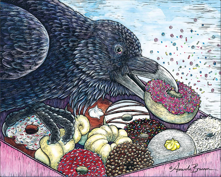 In the next thirty minutes, I watched that raven in amazement. The store has a dumpster off to the side of the parking lot and it was open at the top. The raven landed on the edge of the dumpster as I watched and then dropped down into the dumpster, out of sight. It reappeared in about twenty seconds with a donut in its beak, looked around for a few moments, and then flew off across the parking lot and over some buildings to the south beyond my field of vision. In two minutes, it was back at the dumpster, diving for donuts. Again, it flew away with its prize. Twice more, at two-minute intervals, it got a donut and flew off with it. That was four donuts so far, a lovely Easter feast.