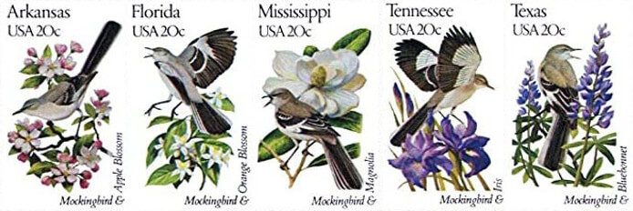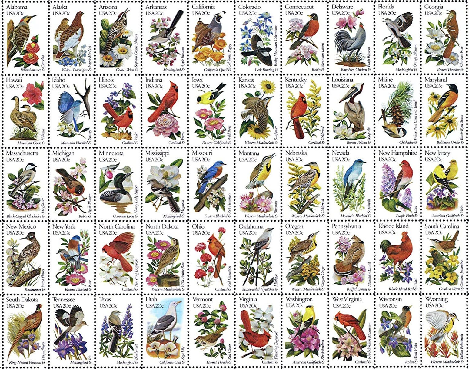 Some of you may remember the U.S. Postal Service (USPS) issuing commemorative twenty-cent stamps in 1982 that featured the state birds of all 50 states. Arthur and Alan Singer of Jericho, New York, were the first father and son team to design stamps for the USPS. Each stamp had the state bird, designed by Arthur, and the state flower, designed by Alan. Each stamp was different even when a particular species (e.g., Northern Cardinal) was the same for multiple states. Two states, North Carolina and Virginia, even had the same bird (Northern Cardinal) and same flower (flowering dogwood).