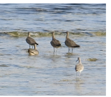 Figure 4. One Whimbrel is partly submerged and is bathing. A Willet watches the group.