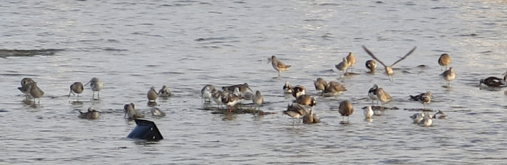 Figure 3. Short-billed Dowitchers, Ruddy Turnstones, and Sanderlings group bathe.