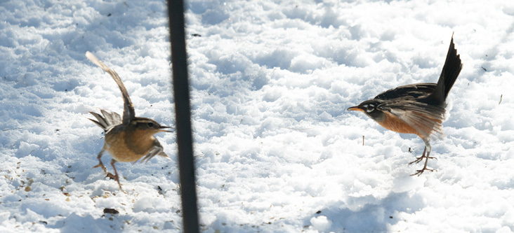 Extreme antagonism of American Robins toward Varied Thrushes has been previously documented in the thrush’s native range on the West Coast (Martin 1970). During an unusually snowy winter in Oregon, the interactions between thrushes and other birds were observed at a feeder area. The author reported that unlike other species encountered by the thrushes, robins were “overtly and persistently aggressive toward the Varied Thrushes….” Not only did robins consistently initiate fights with thrushes, they typically dominated. The reason for the observed aggression between West Coast Varied Thrushes and American Robins was not speculated by the author, but the similar behavior seen at my feeder suggests some sort of innate conflict between the two species that transcends geographic location.