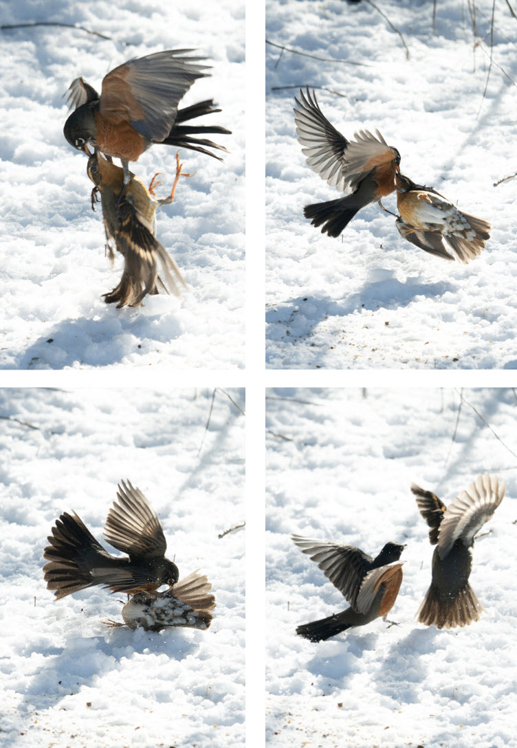 This altercation was behaviorally interesting because this was the first time over the course of a month of watching the thrush that I observed it engage with any other bird, even though it regularly encountered different species feeding in the same space. The robin’s behavior was also intriguing in that it reacted to the thrush’s presence much more aggressively than it reacted to the other species it normally encountered in the feeding area. On several occasions since the altercation, I observed both species visiting the feeder area, but never at the same time. When the robin was feeding, the thrush could sometimes be seen in a nearby tree waiting for its turn.