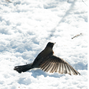 However, mid-morning on January 29, 2021, an unexpected altercation occurred. The thrush flew to the ground as usual, but a sole American Robin that only recently started visiting the feeder area, was already on the ground in the same space as the thrush. Almost instantaneously, the robin focused on the thrush, taking a threatening stance (Fig. 1A). The thrush appeared to accept the robin’s challenge (Fig. 1A) and the birds immediately flew at each other. They physically engaged for no more than one or two seconds (Figs. 1B-1D). As the larger bird, the robin dominated the fight and the thrush retreated into the woods (Figs. 1E and 1F). I was able to spot the thrush a few minutes after the fight, resting on a branch in the woods, seemingly none the worse for wear (Fig. 2). It eventually fed on the ground after the robin departed the area.