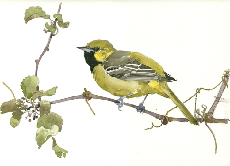 The Orchard Oriole (Icterus spurius) is North America’s smallest oriole and one of its most interesting. The adult male has a black head, back, and tail, and a white wing bar and white edges to the flight feathers on its mostly black wings. Its breast, belly, rump, and shoulders are dark russet. It has a short tail and a short bill. The adult female is greenish yellow below, light olive green above, and has two white wing bars. First- and second-year males resemble females but have black throats, and second-year males have some russet body feathers. Adult males are distinctive, but immature males and adult females can be confused with Scott’s and Hooded orioles in various plumages, although Orchard Orioles are smaller. However, the Orchard Oriole’s range does not overlap with the ranges of either of these species. Orchard Orioles are divided into three subspecies. I. s. spurius breeds in the United States and the other two subspecies are restricted to Mexico.