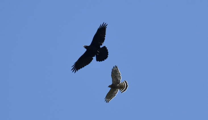Common Raven and Red-shouldered Hawk dueling over the cliffs of Mt. Tom, an excellent place to view raptor migration. Photo by Kim Jones.