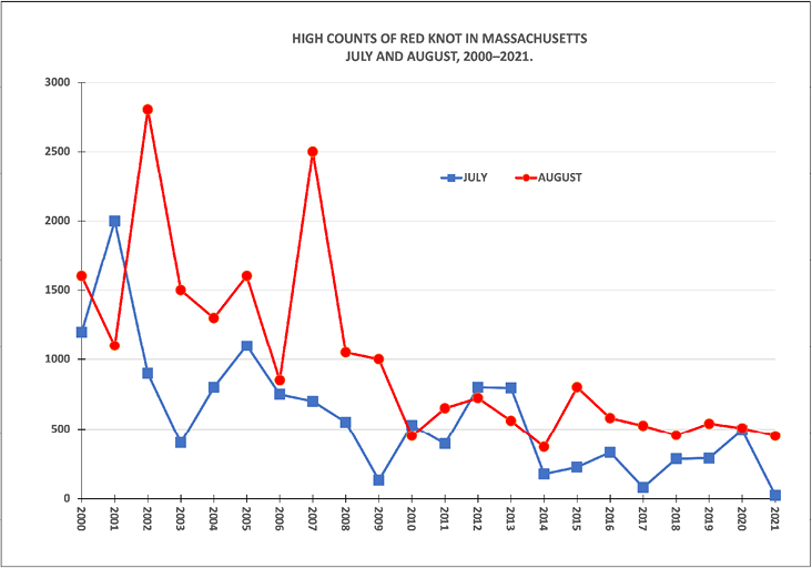 The American subspecies of Red Knot, Calidris canutus rufa, is often held up as the poster child for shorebird population declines—blamed on a combination of climate change, habitat loss, and horseshoe crab over-harvesting in the Delaware Bay, a key stopover site on their annual migration between South America and the Arctic. A count of 25 Red Knots on Monomoy on July 5 is the lowest July record for Massachusetts and well below even last year’s high of 490 (see Figure 1). The August high of 450 is the second lowest this century. Sadly, this low number is consistent with Red Knot reports from the Delaware Bay this spring; northbound migrants represented only about a third of those counted in 2020 (Hurdle 2021). The species has been federally listed as threatened since 2014.