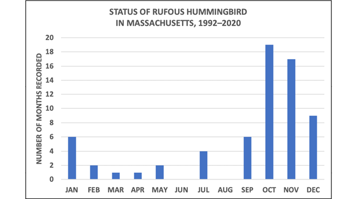 Figure 1. Number of months in which Rufous Hummingbird has been recorded in Massachusetts for the period 1992–2020. Data from eBird.org.