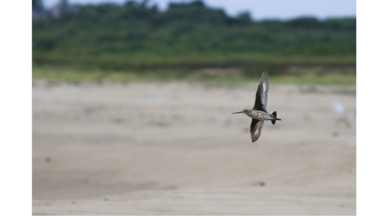 An adult Hudsonian Godwit flies over Whale Point on August 6, after lingering for nearly two weeks.