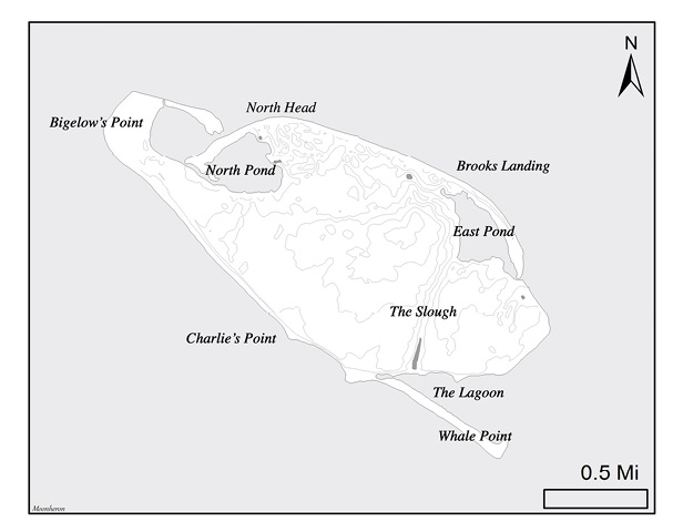 With just 38 residences, Tuckernuck exists without paved roads, an electric grid, or commercial enterprise—and no year-round population. From rare sandplain grasslands to young and stunted maritime oak forests, Tuckernuck hosts at least 14 unique habitat types with their own specialized communities of vegetation (Brace 2012). Both salt- and freshwater bodies occur on the island. Along the northwest side, minuscule kettle ponds host a sustainable population of snapping and spotted turtles, as well as a diurnal roost for both night-heron species. Where one might find an abundance of pinkletinks—as spring peepers are locally known—on nearby Nantucket, the meadows here are notably quiet; not a single frog can be found on Tuckernuck. Just west of the island’s only active runway, a brackish and phragmite-filled outwash pond affectionately known as “the slough” practically slices the island in two. Lazell (1976, p. 35) again sings the praises of this local wonder by claiming it is “one of the prettiest little fossil rivers I know of.” Herring and Great Black-backed gulls nest by the dozens along this morainal divide.
