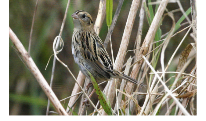 This combination of features at once eliminates any of the sparrow species having unstreaked underparts. The overall delicate aspect and fine-streaked appearance also remove the chunkier and more heavily streaked Fox Sparrow and Song Sparrow as considerations. The broad, unmarked eyebrow stripe, absence of an eye ring, and absence of an obvious necklace of streaks take the Savannah and Vesper sparrows off the table. What is left are five species of grassland or marshland sparrow: Grasshopper in the genus Ammodramus, Henslow’s in the genus Centronyx, and LeConte’s, Nelson’s, and Saltmarsh—all in the genus Ammospiza. These species are small, often somewhat colorful, typically difficult to observe, and possess rather insignificant songs.