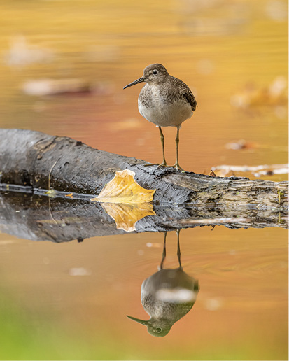It was easy to walk a short distance out into the exposed mud area to obtain a good position to set up for photography. I had a long telephoto lens on my camera and I used a plastic tarp to keep myself and my gear dry. Because the birds were focused on feeding, they did not pay much attention to me, although it was important to keep enough distance so as not to alter their behavior. At one point, a Solitary did march right up close to me within about twenty feet before returning to feeding. On one visit in early October, which happened to coincide with peak foliage, I was able to capture vibrant colors reflecting in the water near the sandpipers.