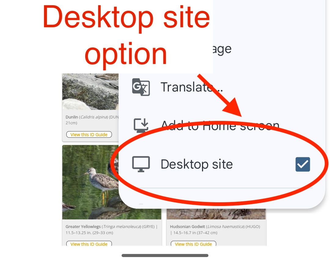 With the shorebird guide open in your phone’s Chrome browser, tap the three dots (red arrow) in the upper-right corner to open a menu: