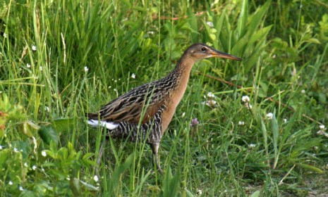 The Virginia Rail, which is 9.5 inches long, is only slightly larger than a European Starling. While exact size can be difficult to judge in a picture, in comparison to the grasses and flowers around it, the mystery rail is much larger than a starling. Its relatively uniform cheek and face pattern, compared to what would be a noticeably contrasting light gray face in a Virginia Rail, and its fairly long thick bill indicate that the mystery bird is not a Virginia Rail. So the choice is between the much larger Clapper Rail and King Rail.