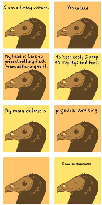 The lack of feathering on the head is an adaptation for sanitation, as vultures frequently poke their heads into putrid carcasses. As an adaptation for hot climates, Turkey Vultures often invoke a process known as urohydrosis, where the birds defecate on their legs and feet, which together with high vascularization of their legs, allows temperature reduction by evaporative cooling—how charming. Spreadwing and delta wing postures probably also serve in temperature control, warming the birds in the early morning sunlight and cooling them later in the day. In cold conditions they may retract their bare necks into their feathers to reduce heat loss. Turkey Vultures have been reported to repel predators by projectile vomiting material that smells foul— lovely.