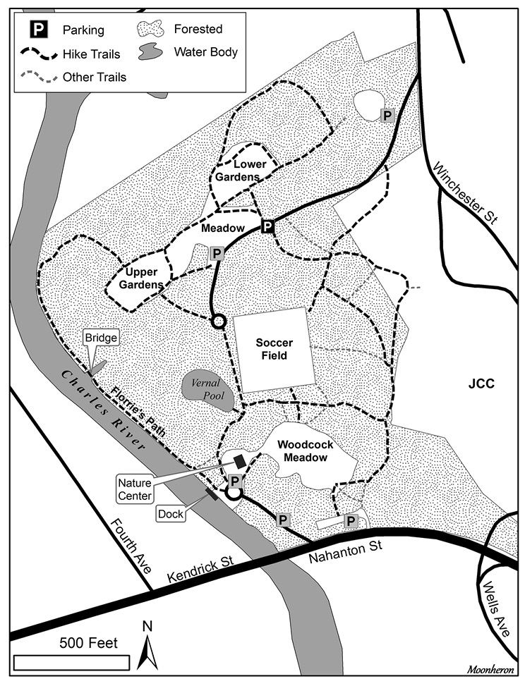 From many locations, the convenient way to get to Nahanton Park is via the new Exit 19A off Interstate 95 (I-95) that opened in December 2017. Coming from the north, take Exit 19 (C, B, A) and follow the exit road parallel with the highway toward Exit 19B–Highland Avenue, but continue straight past Exit 19-B for 0.25 mile and take Exit 19A–Kendrick Street. Turn left on Kendrick Street. In 0.5 mile, you will cross the Charles River into Newton, at which point Kendrick Street becomes Nahanton Street. The nature center and kayak rental entrance to the park, 455 Nahanton Street, will be immediately on your left. You can use that parking lot or, to reach the starting point described in this article, continue driving straight past the JCC and Wells Avenue, turn left on Winchester Street, and in approximately 0.3 mile, turn left at the entrance to Nahanton Park, which is 525 Winchester Street. If you pass the golf course, you have gone too far. Note: GPS directions to Nahanton Park will take you to the Nahanton Street entrance; you have to specify the street address for directions to the Winchester Street entrance.