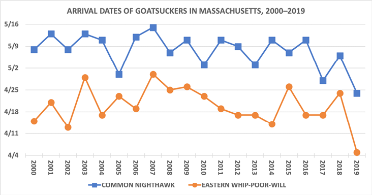 For many species, spring migration this year was early to exceptionally early and this was particularly so for the goatsuckers (see Figure 1). Common Nighthawks are rarely reported in April, and this year's dual report of singles on Nantucket and Manomet on April 24 are the earliest records this century, beating the 2017 date of April 28. Historically, though, this species has been reported as early as March 14 in 1925 and 1966 (Veit and Petersen, 1998). Two Eastern Whip-poor-wills in Middleton on April 4 are also the earliest this century, beating the 2002 record of April 13 by over a week. With a previous early record of April 12, 1957, (Veit and Petersen, 1998) this year's record may also set a new state early date. Chimney Swifts arrived on April 15, three days earlier than average this century, and Ruby-throated Hummingbirds appeared the next day, eight days earlier than their average.