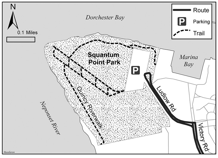 This state park, run by the Massachusetts Department of Conservation and Recreation, is approximately 50 acres, consisting of mostly wet, early successional forest and the maintained grassy strip of the former airport runway. The Neponset River flanks the west side of the property and flows into Dorchester Bay. (See Figure 3. Map of Squantum Point Park.) Two entry points at either end of the parking lot lead to the loop walkway around the old airstrip. An early morning visit is preferable because this is a favorite place for dog walkers.