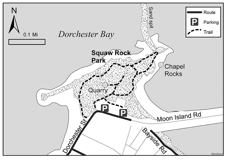 Squaw Rock Park is Squantum's best migrant trap, another classic "boom or bust" kind of place during migration. Birders know it as Squaw Rock, but it also goes by Nickerson Beach or Chapel Rocks. Continue driving along East Squantum Street and go left when the road forks; it becomes Dorchester Street, hugging the seawall. In about 0.6 mile, just before the road curves right, you'll approach a wooded area on the left and then a set of low cinder block buildings (a former Cold War Nike missile site). You can park along the road in front of the Mollie Hirshberg Learning Center or turn left into the parking lot for the Robert I. Nickerson VFW Post 382. A trail skirts the edge of the park, and several less-traveled trails crisscross the center. It's easy to find your way around this small property. (See Figure 2. Map of Squaw Rock Park.)