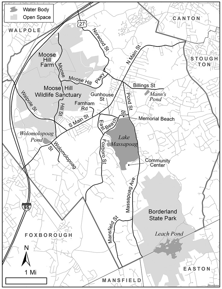 About halfway between Boston and Providence and easily accessible by either Interstate 95 (I-95) or the Massachusetts Bay Transportation Authority Commuter Rail Providence/Stoughton line, lies the town of Sharon. From the 1800s until the 1940s, Sharon was a summer resort town where people came to stay at inns and hotels around Lake Massapoag. The town's current community center, located on a hill overlooking the south end of the lake, is a restored hotel that was acquired by the town in 1967.