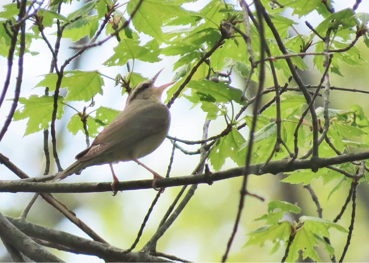 One of highlights of the breeding season is the number of Worm-eating Warblers that breed at Moose Hill. They have expanded in the last five to ten years, going from only a few pairs to close to 30 pairs. They can now be found on most trails at Moose Hill, but the highest densities are along the Summit Trail, the Bluff Trail, and the Kettle Trail/Ovenbird Trail area, which is the original hotspot for this species. On the Trustees' property, the best trail for Worm-eating Warblers is the Woodland Trail. For the past couple of years, one pair has been relatively easy to get as a drive-by from Moose Hill Street just south of the power line crossing. I have not explored much of Borderland State Park, where there seems to be only a small population.
