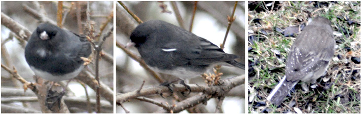 Figure 2. Return of the juncos? Left: Junco with a white breast spot, perhaps Heart, seen on November 16, 2018. Center: Junco confidently identified as Lefty based on the single distinctive white feather on its left wing, also on November 16, 2018. Right: Junco likely to be Popsicle on November 28, 2018. Photographed by the author.