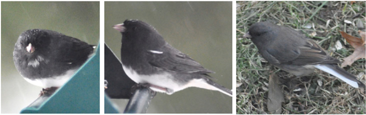 Figure 1. Dark-eyed Juncos dubbed Heart (left), Lefty (center), and Popsicle (right) based on their distinctive patterns of white feathering. Photographed by the author on January 20, 2018.