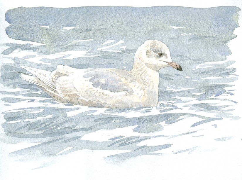 The Iceland Gull (Larus glaucoides) is one of the world's most interesting and enigmatic gull species because its Arctic homeland makes it difficult to study. The variability in plumage and hybridization among the species' three subspecies makes identifying an individual to the subspecific level problematic. The nominate population of the Iceland Gull (L. g. glaucoides) is a "white-winged" gull that is smaller than a Herring Gull (L. argentatus). Most individuals of the race glaucoides lack gray on the wingtips. Adults have a light gray mantle and upper wing surface; immatures tend to be creamy brown as juveniles that turn whiter by their second year. The Kumlien's subspecies (L. g. kumlieni) is similar in all plumages, but has a highly variable amount of gray in the primary feathers, producing wing tips that vary from practically all white to dark gray, often making it hard to separate some of them from the Thayer's subspecies (L. g. thayeri), which has blackish wing tips. All subspecies have yellow bills with a red spot on the lower mandible and pink legs. Immatures have black bills.