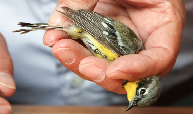 A Magnolia Warbler held in a classic bander's grip, displaying its new leg band. All photographs by Pauliina Swartz.