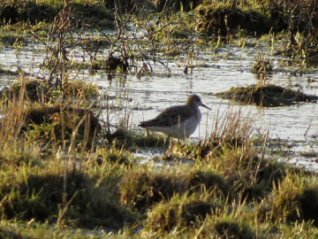 A Reeve (female Ruff) turned up on March 30 with a flock of yellowlegs in the Scotland Road Wet Meadows area of Newbury. Marj Watson was the first to document it (her photo is above), originally thinking that it was one of the yellowlegs, but when she posted her photos on Flickr, Nate Dubrow noticed and confirmed the bird’s true identity. A horde of birders enjoyed the Reeve’s continuing presence the next day, but beyond that it was not relocated.