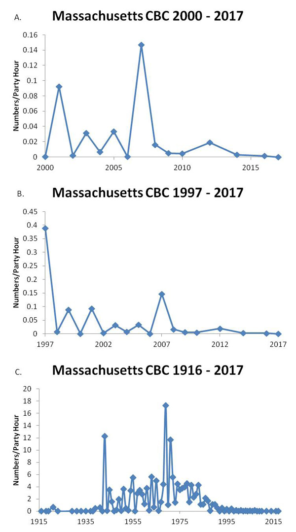 This chubby bird with its flagrant colors is an irruptive species that wanders in large flocks usually in response to low food supplies (Gillihan and Byers 2001). So I wasn't surprised that I hadn't many encounters with them for more than 40 years. But upon further reading, I learned that Evening Grosbeaks appear to have been declining across their range for several decades (Bonter and Harvey 2008, Ralston et al. 2015). I decided to look at the Massachusetts Christmas Bird Count (CBC) data (Pardieck 2019) for myself and was relieved to see that in this century the numbers of observations varied year to year as expected but didn't appear to be declining (Figure 1A). For some reason I decided to rebuild my graph with an even 20 years and that's where I was shocked (Figure 1B). The decline at the end of the 1990s was dramatic, showing that the 18 years in my first look were only 25% of 1998–1999. As I looked at the entire CBC data set (Figure 1C) the pattern was clear, counts per party hour in the 50s to 80s were about 4, with peaks of 11 and 17 during my years in Grafton, compared to the twenty-first century average of 0.024 counts per party hour.
