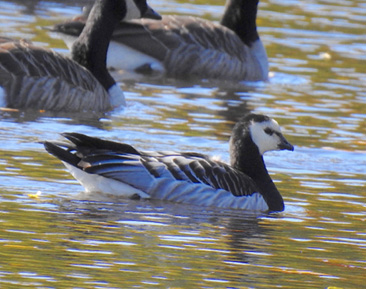 Kevin Barnes and Sasha Auer found a Barnacle Goose at Tri-Town Beach in Whately on October 12. It was accompanied by four other geese which appeared to be hybrids of Barnacle with Cackling. After being seen on and off through October 16, they relocated on the 17th to Paradise Pond on the campus of Smith College in Northampton, noticed there by Katie Doe. They were gone the next day, and found in Connecticut a few days later. Mary McKitrick took the above photo.