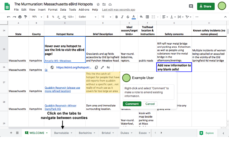 Figure 1. A subset of information available in The Murmuration. Hotspot names include links to corresponding locations on eBird.org. There are separate tabs in the spreadsheet for each county in Massachusetts. Empty cells can be populated with information, and comments on existing cells alert moderators to information updates.