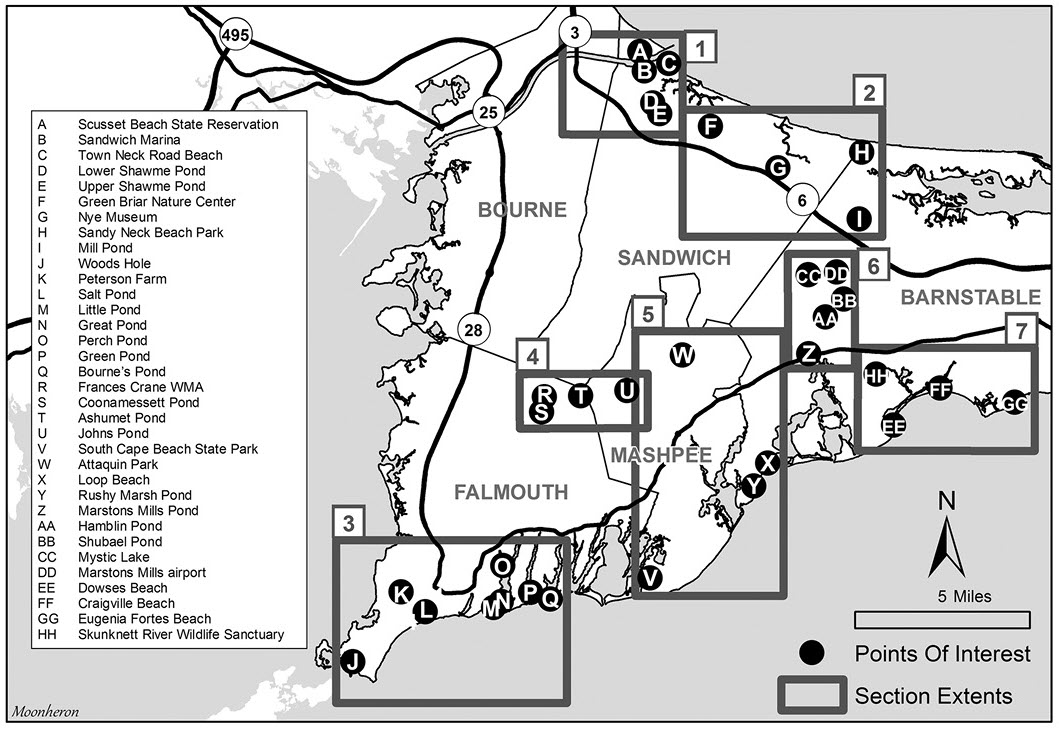 This section centers around the eastern mouth of the Cape Cod Canal, which winds through the northwest corner of the town of Sandwich. Thousands of waterfowl winter here, often providing opportunities for close viewing. Sandwich also includes a pair of productive inland ponds. Sought-after birds include King Eider, Harlequin Duck, Razorbill, and Great Cormorant.