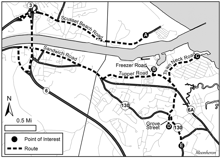 Returning to Route 3, cross the Sagamore Bridge, and take Exit 1C-6A Sagamore. Turn right on Route 6A. In 1.9 miles, turn left onto Tupper Road, and in 0.4 mile, turn left onto Freezer Road to enter the Sandwich Marina (B) and the Cape Cod Canal Visitors Center. You will see many of the waterfowl you saw at Scusset, although at a greater distance. There are often good numbers of gulls roosting here that may include Iceland, Glaucous, or Lesser Black-backed gulls. Brant often forage on the grassy field adjacent to the parking lot. In the marina, you may get close looks at Common Loon and Red-breasted Merganser. Common Raven has nested at the adjacent power plant and is seen year-round.