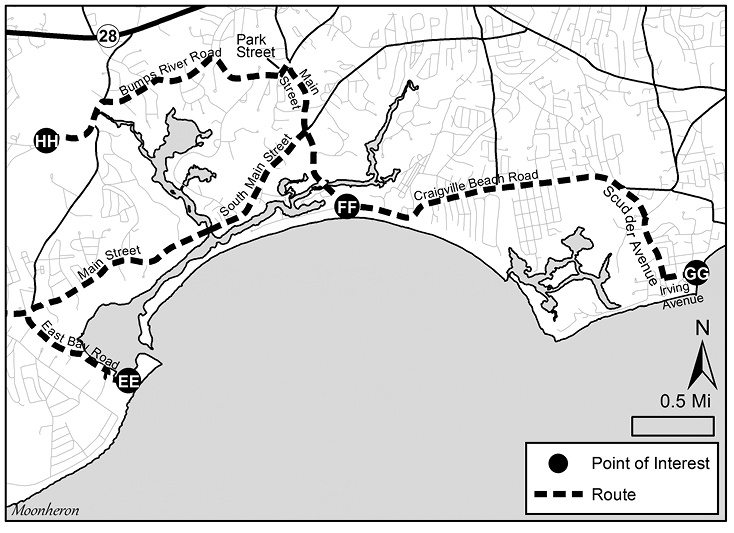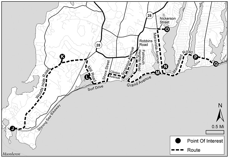 Start your coastal Falmouth birding in Woods Hole (J), the farthest southwest point, and work your way northeast from there. To reach Woods Hole from off-Cape, follow Route 6A west from the Sagamore Bridge for 5.4 miles to the Bourne Rotary. Or, if you cross the Bourne Bridge, this is where you will begin. Take the exit onto MA-28 S/MacArthur Blvd toward Falmouth/Woods/Hole/Martha’s Vineyard. At the next rotary, take the second exit to continue on Route 28 south to Falmouth/Woods Hole. Follow Route 28 south for approximately 9 miles until it turns into Palmer Avenue. As you continue south, the road’s name changes to Woods Hole Road. In another 4.7 miles you will reach Woods Hole, home of the Woods Hole Oceanographic Institute, a charming little village that can be a lot of fun to poke around in winter. Nobska Point Light and Nobska Pond are worth visiting for raptors and puddle ducks. The Great Harbor area is good for sea ducks, Great Cormorant, and occasionally Purple Sandpiper, and there are many productive thickets around town. There is also a free aquarium that can provide a break from the cold. Be aware that parking is usually metered and is enforced year-round.