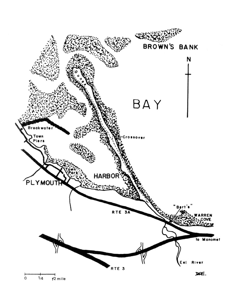 Bruce Sorrie wrote the above in summary to an article that appeared twelve years ago in Bird Observer, volume 1, May-June 1973. Evidently, for many Massachusetts birders the location of Plymouth Beach (between the Cape and Plum Island, but not close enough to either) and the logistics of getting out there and back (walk six miles or use an off-road vehicle) still prove too much of an effort. Consequently, Plymouth Beach still does not enjoy the recognition it surely deserves. The purpose of this article is to show that Plymouth Beach "sleeps" no more: since Bruce's prophecy, over fifty additional species have been documented. First, as a testimony to this area's pedigree, I present a fully researched list of the 243 species reliably recorded from 1945 to 1984 in the area defined in the accompanying figure. A detailed annotation then follows, offering any birder who wishes to discover Plymouth Beach the advantage of better knowing where and when to look. In a broader ecological perspective, leaving rarities like Burrowing Owl and Sharp-tailed Sandpiper aside, Plymouth Beach is of major importance to literally tens of thousands of wintering waterfowl and migratory shorebirds, over a thousand nesting terns, and a valuable few struggling pairs of Piping Plover. How long Plymouth Beach will maintain such an impressive concentration and diversity of avian forms will depend on the amount of future interest taken in this exciting place.