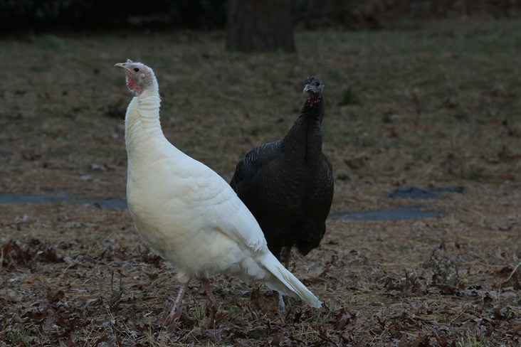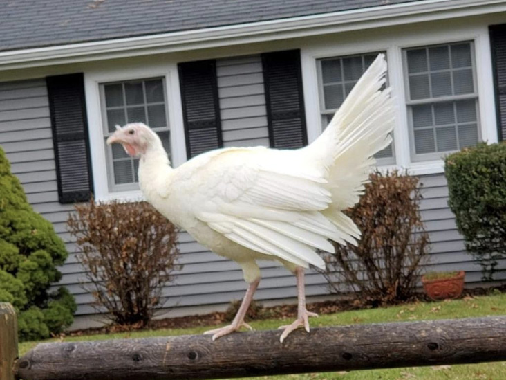 The ‘all-white meat' turkey in the accompanying photo was seen on Cape Cod in the Yarmouth area around Thanksgiving. Most, if not all, of the feathers appear completely white, the skin is pale, and even the nails are white. The eye, however, appears dark, which would suggest that this bird is leucistic rather than albino.