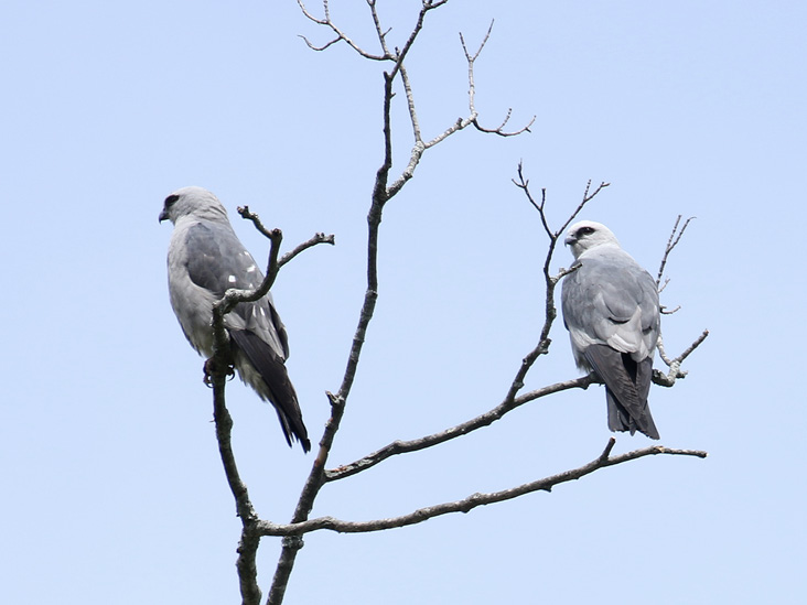 - Nesting Behavior: Unlike Mississippi Kites in other parts of the country, these kites are tolerant of human activity. The birds are oblivious to anything going on below them, including dogs barking, lawn mowers blasting, kids screaming, or hordes of birders watching them from the street nearby. Some homeowners have been tolerant as well, with youngsters setting up lemonade stands for visiting birders.
