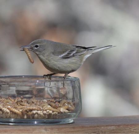 With four of the warbler species above eliminated, only the Pine Warbler (Setophaga pinus) remains as a solid identification candidate. And as noted in the opening sentence, Pine Warblers love to eat mealworms during the winter when they occasionally visit backyard bird feeders in small numbers, especially near the coast and on Cape Cod and the Islands.