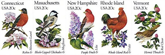 The state birds of Connecticut, Massachusetts, New Hampshire, Rhode Island, and Vermont.