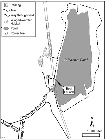 Although the trail completes a three-mile loop around the pond, the winged-warbler habitat is located within 0.4 mile of the trailhead. From the parking lot, head east toward Colchester Pond, following the trail downhill. Just before the dock at the end of the trail, turn left under the power lines. From here, the trail continues just under 0.25 mile along the west shore of Colchester Pond. After passing a tree line on the left-hand side of the trail, turn uphill through the hayfield to the power line, about 120 yards away. Take care to stay close to the tree line to reduce the risk of stepping on a Bobolink or Savannah Sparrow nest, since they prefer nesting toward the center of a field.