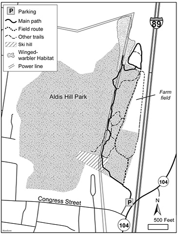 The best winged-warbler habitat at Aldis Hill and Hard'ack Recreation Area is limited to a roughly nine-acre area just north of the park. Most of this prime habitat is on private property; however, the southern end dips into the park and is accessible from some of the park's trails. Additionally, you can sometimes find winged-warblers using the power line corridor that stretches 0.5 mile north from the ski slope. To reach this area from the parking lot, follow the gravel road north past the gate, and continue until you reach the ski slope. Keeping the power lines above you and the hum of vehicles on I-89 to your right, enter the trail system and head north. Do your best to stay in or near the power line, and keep walking north until the trail reverses sharply to the south and there are no other trails heading north from this point (44.822739, - 73.065295). This is the best location within the power line corridor and on a trail to find winged-warblers. For more adventurous seekers, a game trail meanders north from the mowed path. You can follow it for several dozen meters, getting closer to the prime habitat roughly 400 feet farther north.